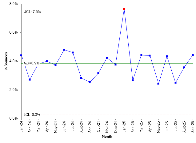 The key is to interpret the control chart. As long as all the points are within the control limits and there are no patterns (like 8 in a row above or below the average), the process only has noise. In control chart terminology, the process only has common cause of variation present and is in statistical control. You don’t know what the % bounces will be next month, but you know, since there is only noise in the process, the next month will be between the LCL and UCL with a long term average of .