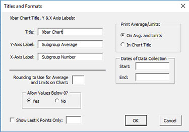 - Y-Axis Label: label to put on the Xbar chart vertical axis; default is “Subgroup Average”