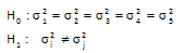 The Bartlett test performs the following hypothesis test for our five product lines. The null hypotheses is that the variance is the same for all product lines. The alternate hypothesis is that the variances are different for at least two product lines.