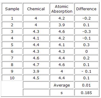 The first step in analyzing the results is to take the difference between the results for chemical (method 1) and atomic absorption (method 2) for each sample, retaining the sign:
