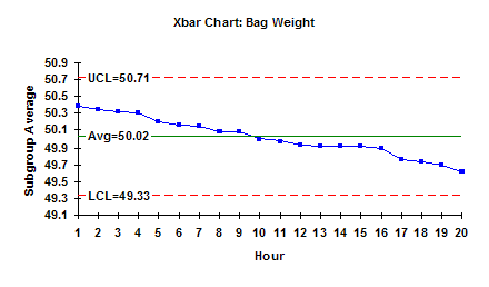 The chart shown above will produce the same average and the same calculated standard deviation as the first Xbar chart shown on bag weight. But doesn’t it tell a different story? So simple. Just plot the data over time and you will be amazed at what you learn.