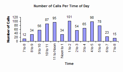 Early in the morning and late in the evening, there are not that many calls. But the calls spike in late morning, early afternoon and just before closing. This information can be used to determine when to schedule breaks or when to add additional people to help answer phones.