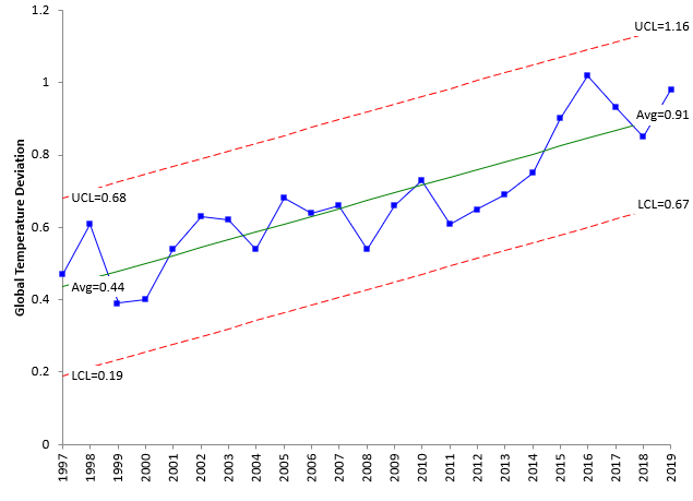 The first thing to do is to simply make a control chart with no splits or trend analysis. Figure 4 is the control chart for global temperature deviations from 1997 to 2019.