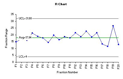The range chart indicates that the variability of the process is quite stable and all fraction ranges are close to the overall range average. However, fraction 19 shows the highest range when compared to the remaining fractions. Inspection of the individual assay results of the ten tablets in fraction 19 shows that the wider range was caused by presence of highest assay value 113.8% and the lowest assay value 87.2. In pharmaceutical practices, it is not uncommon to face such variability at early stage of process optimization.