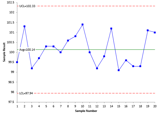 If the “true” average of the sample is 100 and the “true” standard deviation is 0.75, then 68% of the time the repeated measurement will be between 99.25 and 100.75. 95% of the time the repeated measurement will be between 98.50 and 101.50. And 99.97% of the time, the repeated measurement will be between 97.75 and 102.25. This is shown in Figure 4.