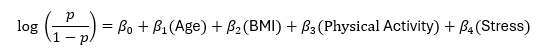 So, the model estimates the probability that a person has hypertension given their age, BMI, physical activity, and stress score.