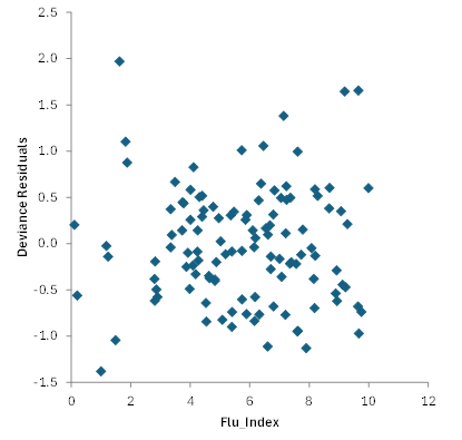 There is often more output associated with the Poisson regression. Residuals analysis is one example. We will not cover that in detail here, but residual analysis helps you identify outliers in the data. You can plot residuals against various factors. For example, Figure 1 is a plot of Deviance residuals vs Flu_Index. Absolute deviance residuals greater than 3 are considered outliers.