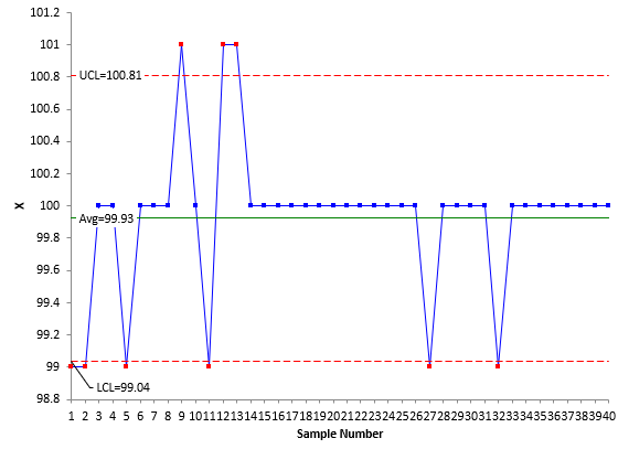 Note that there are eight points beyond the control limits on the X chart and 1 out of control point on the moving range chart. These out of control points occurred simply because of the way we rounded the data. They have nothing at all to do with the process – which the article above shows was in statistical control. The out of control points are the result of excessive rounding. This type of data can lead to false alarms. You can get out of control points when the process is actually in statistical control.